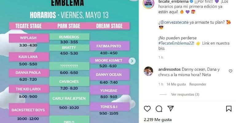 Wiplash se presentará a las 15:30 hrs, Kaia Lana a las 17:00 hrs, Danna Paola a las 18:20 hrs, The Kid Laroi a las 20:00 hrs y cerrarán los Backstreet Boys a las 22:00 hrs, ese es el itinerario de este viernes 14 de mayo para la primera edición de Tecate Emblema.