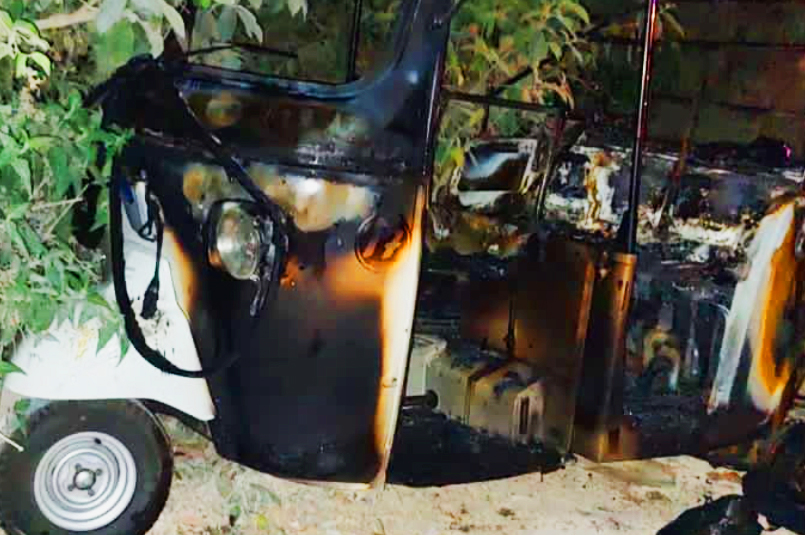 Un mototaxista fue golpeado anoche, dejándolo dentro de su vehículo, mismo que fue rociado con gasolina e incendiado, lo que fue seguido de un ataque a balazos contra la casa de la dirigente de este sindicato, sin personas lesionadas.